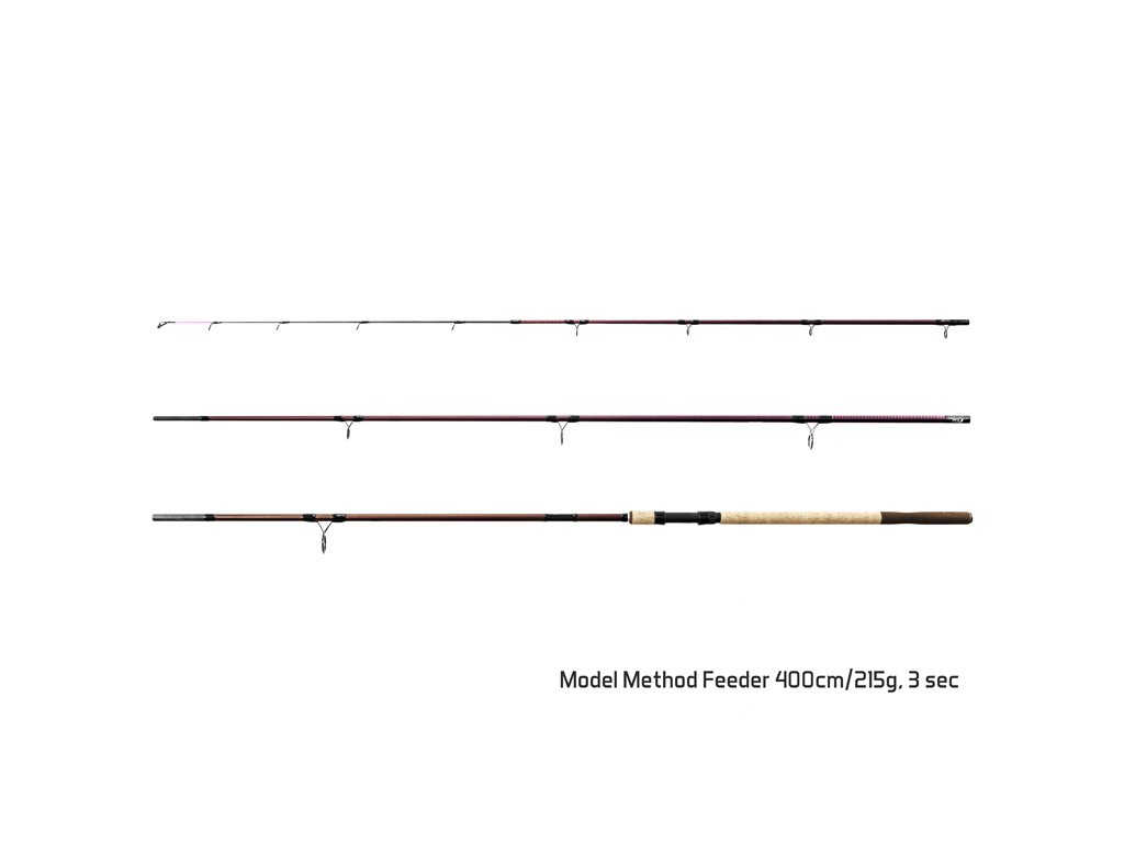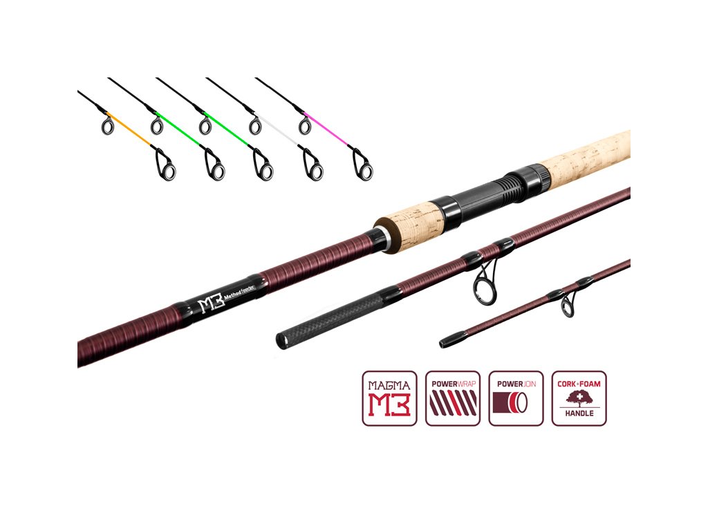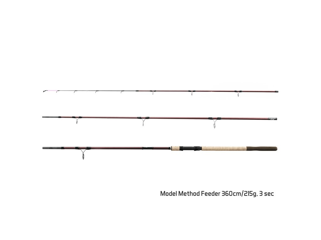Řada vínově bordových prutů Delphin MAGMA M3 je již třetím pokračovatelem nejúspěšnější série feederových prutů značky Delphin. Snažili jsme se zachovat všechno to, co dělá tyto pruty bestsellery, ale i přidat něco zcela nového, abychom opět posunuli výše pomyslnou laťku kvality, požitku z rybolovu a spolehlivosti. Právě to stálo za zrodem vývoje technologie Delphin 2Power. Tato technologie se skládá ze dvou podsegmentů, a to PowerWrap a PowerJoin. Oba segmenty jsou aplikovány na každém modelu série MAGMA M3. PowerWrap si všimnete okamžitě při kontaktu s prutem. Jedná se o dodatečné vinutí karbonu po celé délce prutu, kterým jsme dosáhli výrazného zvýšení pevnosti. Také zvyšuje odolnost vůči momentovému přetížení prutu. V praxi to znamená výrazně vyšší životnost prutu a snížení náchylnosti na mechanické poškození. Sekundárním aspektem tohoto vinutí je vizuálně velmi přitažlivý prvek strukturovaného blanku. PowerJoin není tak nápadným detailem jako wrap, je však neméně důležitým prvkem tohoto povedeného celku. Obnáší totiž malý kovový kroužek na konci každého spoje, což výrazně snižuje možnost tříštivého poškození blanku. Navzdory této zesilující kůře jsme zapracovali na štíhlosti blanků a tedy opět můžeme směle potvrdit, že patří jednoznačně mezi nejštíhlejší ve své třídě. Také si blanky zachovávají své nadprůměrně výborné vlastnosti z hlediska nahazování i zdolávání s parabolickou akcí. Blanky jsou osazeny kvalitními odlehčenými SiC očky, které skvěle vedou vlasec. Rukojeť je pokryta korkem, na který příjemně navazuje profilovaná hnědá EVA pěna, jejímž úkolem je nahradit korek na těch nejvíce exponovaných místech. Ukončena je elegantní hliníkovou koncovkou. Tato rukojeť dokonale padne do ruky a ještě zvyšuje komfort z používání daných prutů. Prut je osazen odlehčenými SiC očky vysoké kvality. Ty dokonale rozdělují sílu po celé délce blanku a spolehlivě vedou vlasec při náhozech nebo zdolávání ryb. Pruty jsou dodávány s pěti druhy špiček různé tvrdosti. Technické parametry: Model Method feeder 360cm / 215g Počet dílů: 3 Průměr blanku nad rukojetí: 13,61mm Počet oček: 12 Transportní délka: 126cm Hmotnost: 286g Rukojeť: Korek a EVA pěna Délka rukojeti (od spodní části prutu po střed sedla): 49cm Velikost naváděcího očka: 30mm Model Method feeder 400cm / 215g Počet dílů: 3 Průměr blanku nad rukojetí: 13,61mm Počet oček: 13 Transportní délka: 140cm Hmotnost: 316G Rukojeť: Korek a EVA pěna Délka rukojeti (od spodní části prutu po střed sedla): 52cm Velikost naváděcího očka: 30mm Model Method feeder 430cm / 215g Počet dílů: 3 Průměr blanku nad rukojetí: 13,61mm Počet oček: 14 Transportní délka: 149cm Hmotnost: 342g Rukojeť: Korek a EVA pěna Délka rukojeti (od spodní části prutu po střed sedla): 54cm Velikost naváděcího očka: 30mmDoplňkové parametry