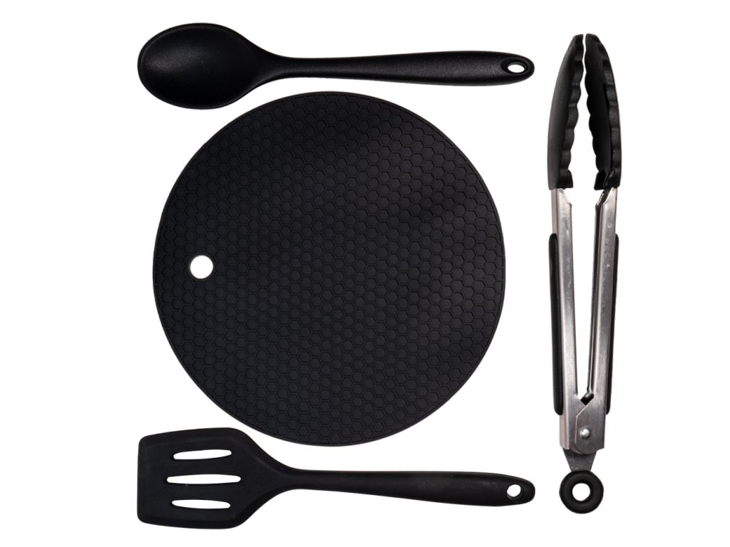 Součástí sady je odkládací podložka, grilovací kleště, obracečka a lžíce. Vyrobeno za 100% potravinářského silikonu, kterým zároveň chráníte své nádobí proti poškrábání. Specifikace: - délka kleště: 20 cm - délka obracečka: 21 cm - délka lžíce: 20 cm - průměr podložky: 18 cm - hmotnost celé sady: 168 g Odkaz na video: http://www.youtube.com/watch?v=xki0uIia86oDoplňkové parametry